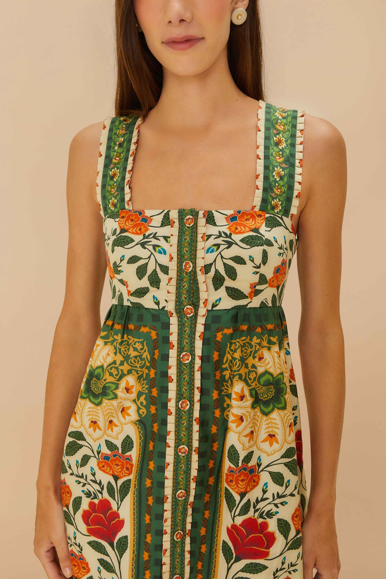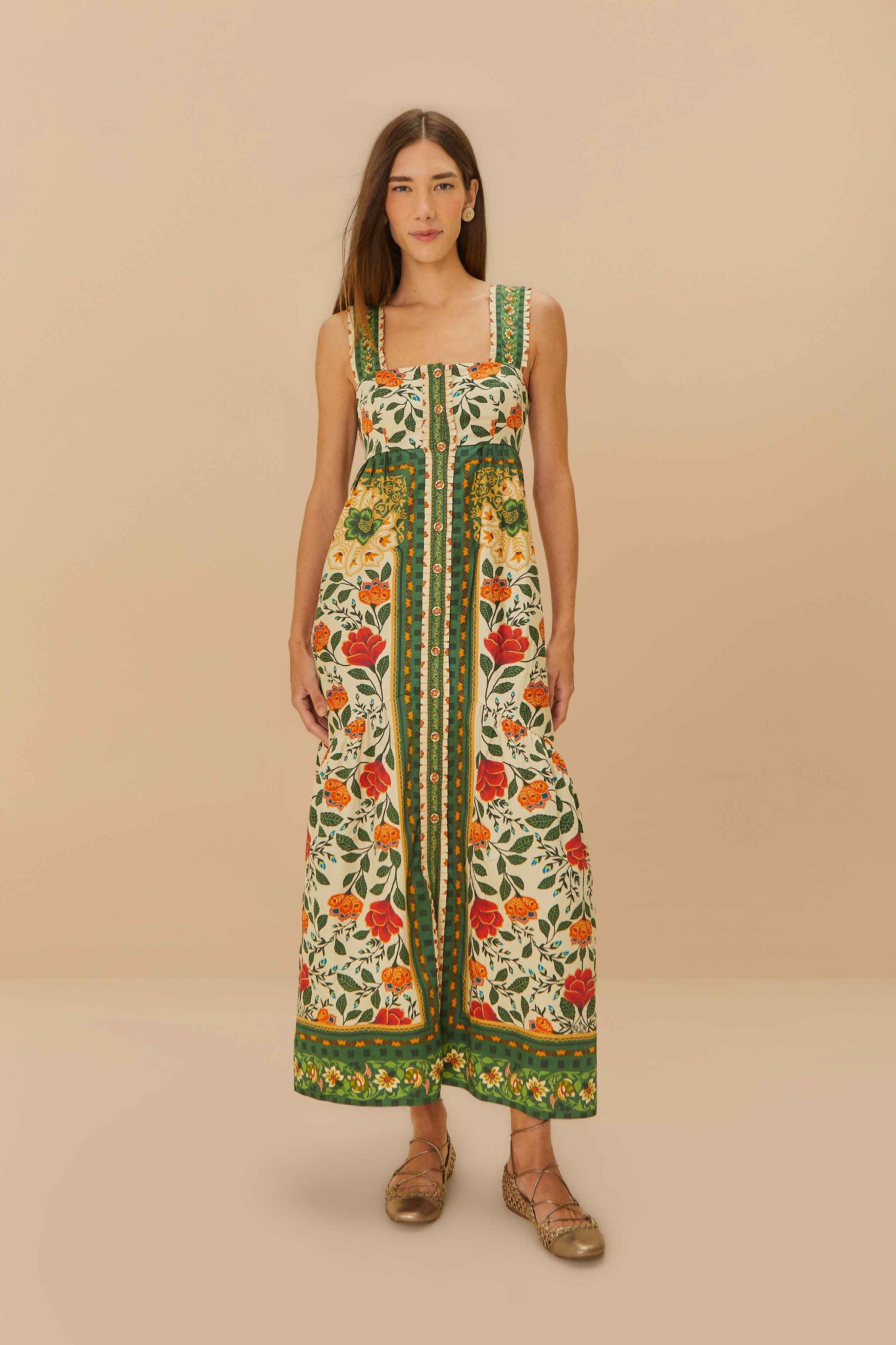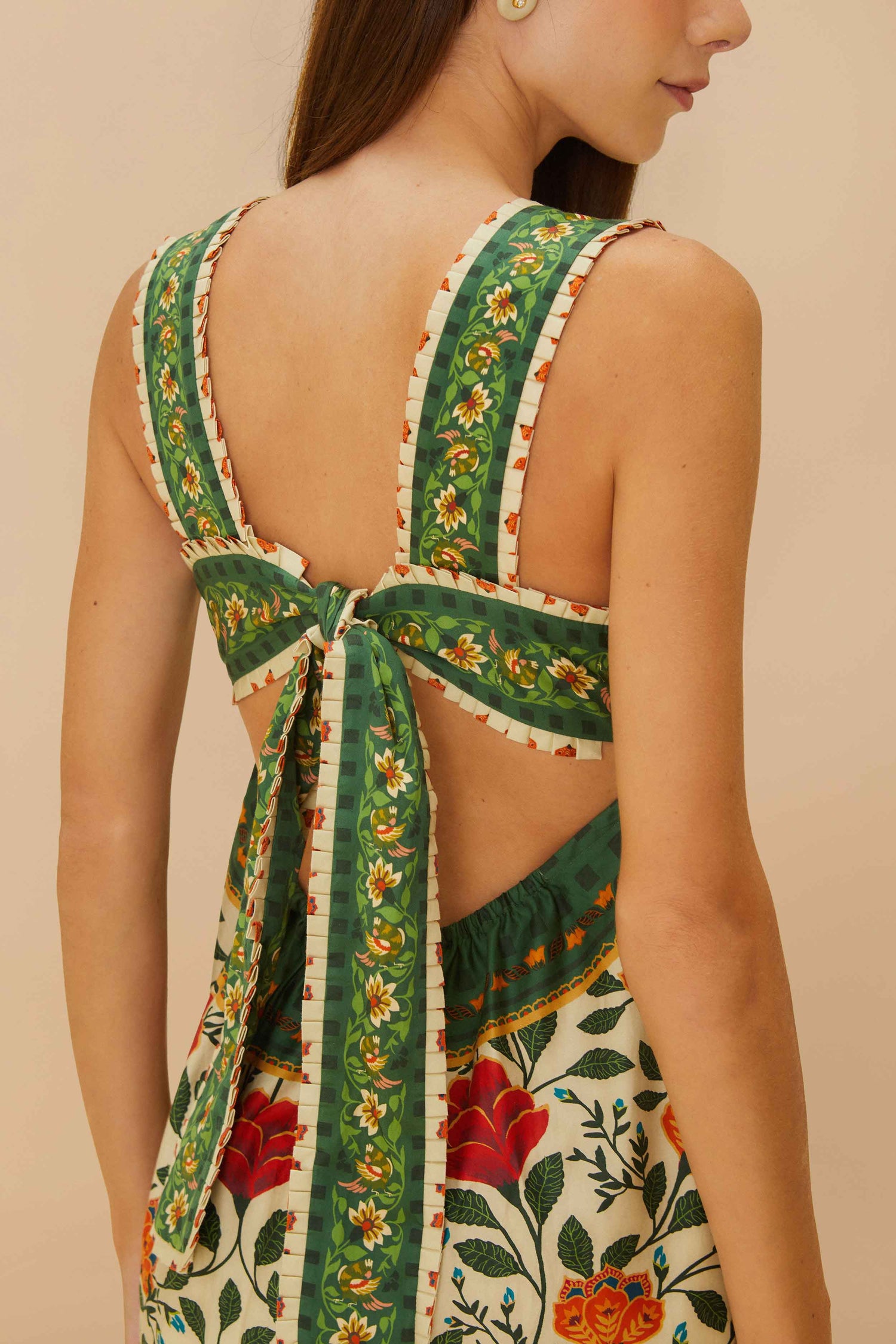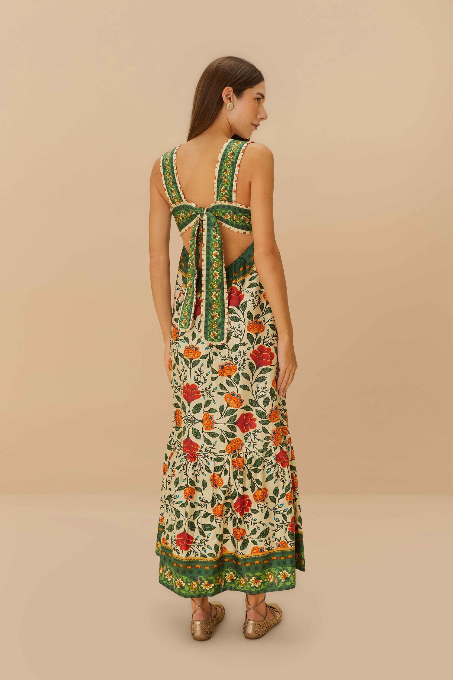 Déjate seducir por el vibrante encanto del vestido Sand Garden Tapestry Back Bow Maxi Dress. Esta encantadora prenda exhibe un rico tapiz de colores, con intrincados estampados florales que bailan sobre el tejido. El escote cuadrado añade un toque de elegancia atemporal, mientras que la silueta maxi fluida ofrece gracia sin esfuerzo. Un divertido lazo en la espalda completa el look, infundiendo un toque de fantasía y encanto que captura la alegre esencia de FARM Rio.