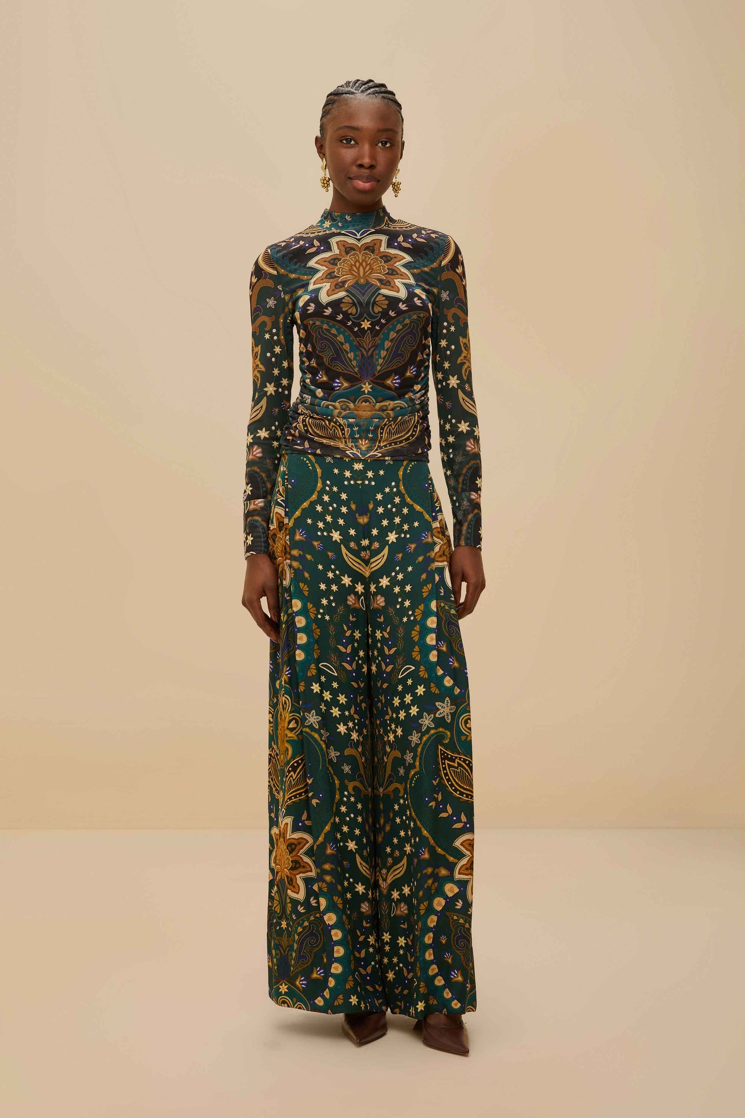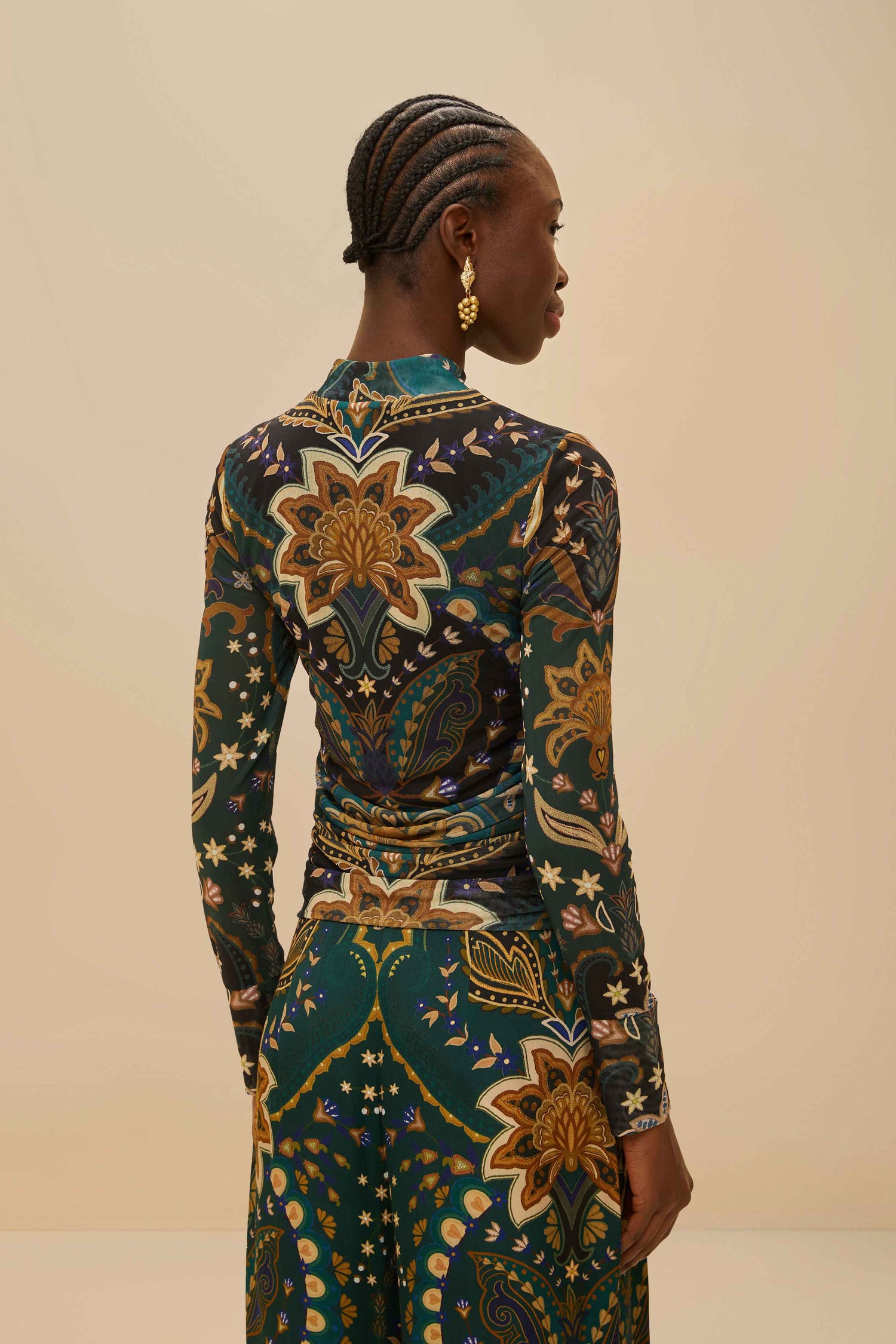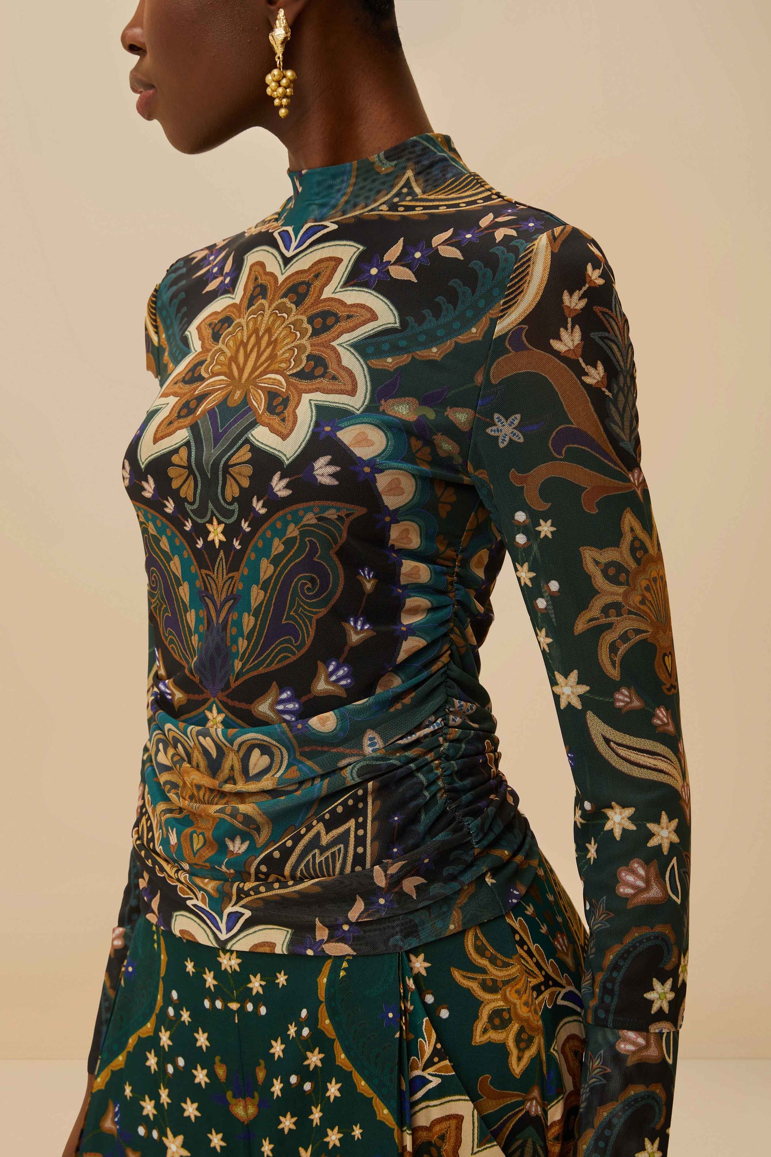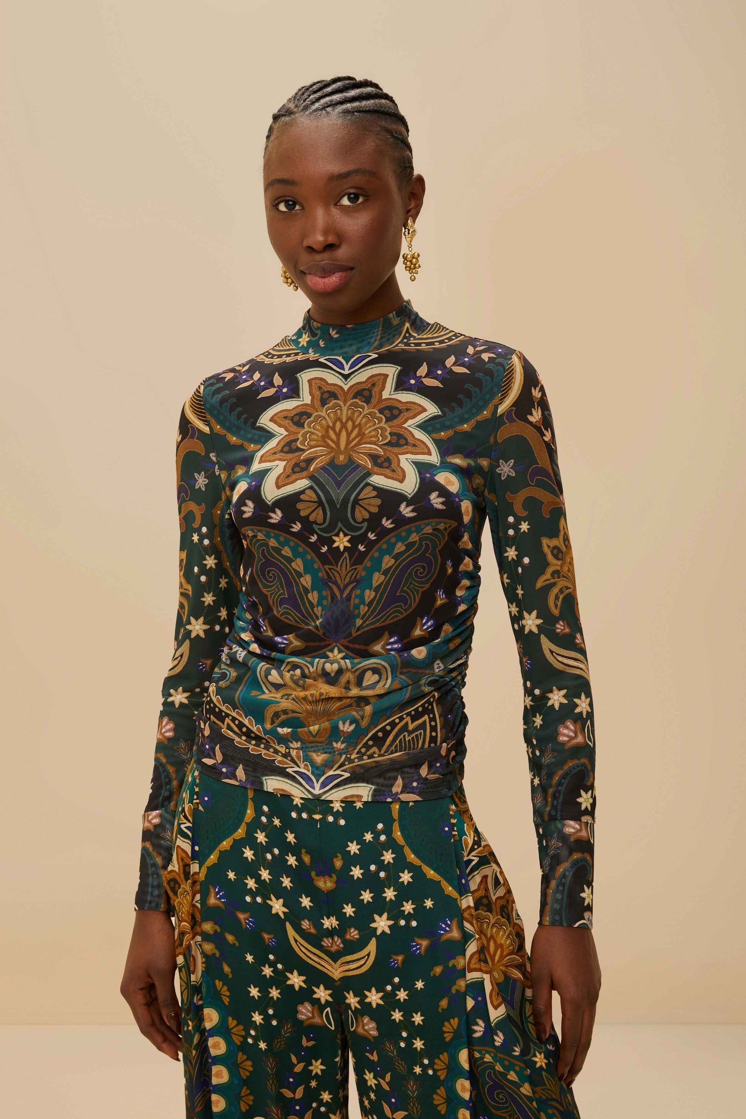 Abraza la esencia de la elegancia con la blusa negra de tul Jaipur de FARM Rio. Adornada con intrincados estampados florales y de cachemira en ricos tonos tierra, esta blusa presenta un cautivador escote alto y mangas transparentes que destilan una suave jovialidad. El tejido de tul cae suavemente, creando una silueta elegante que es a la vez sofisticada y de ensueño, por lo que es una adición atemporal a su guardarropa.
