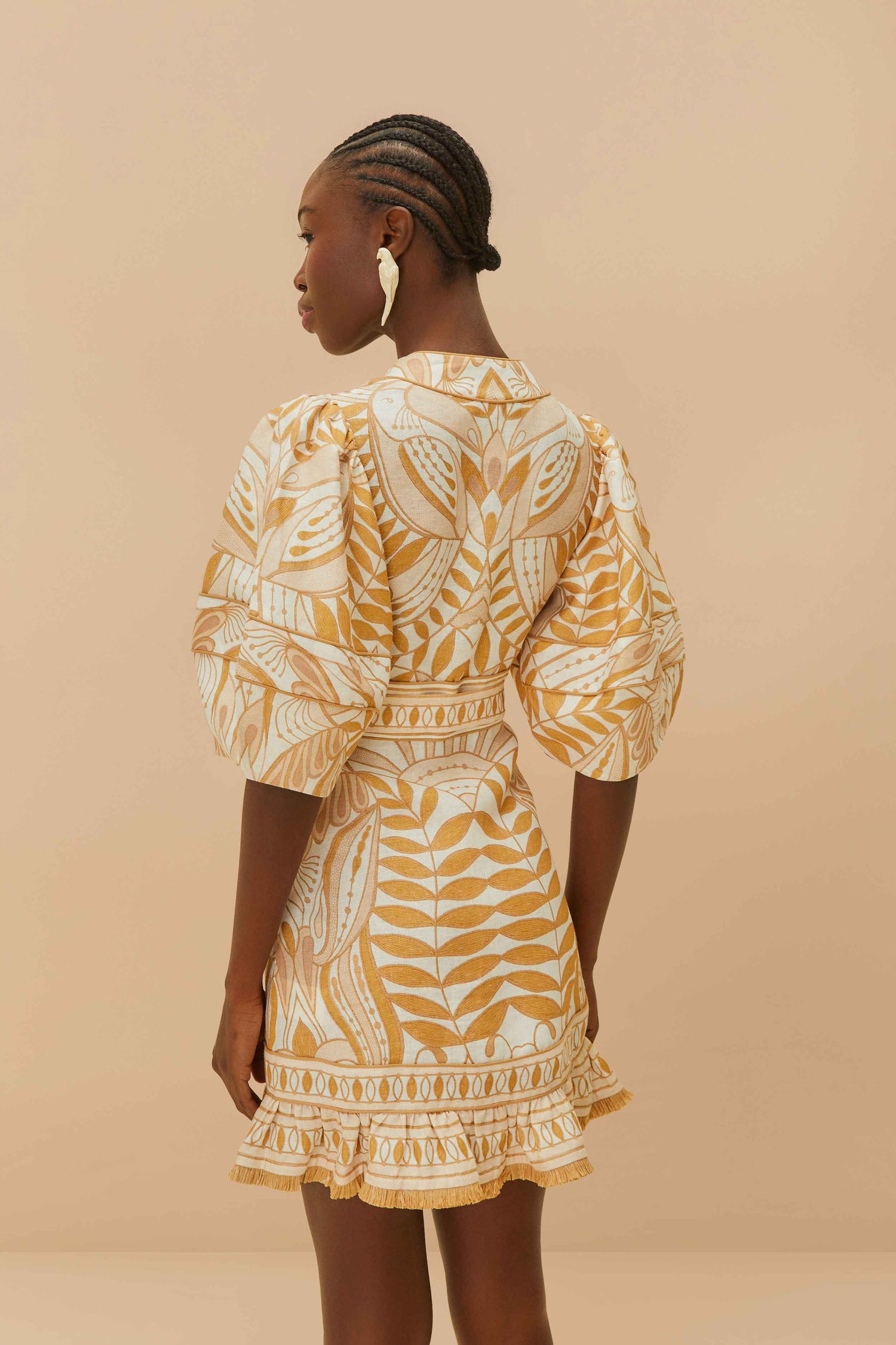 Abraza el encanto del minivestido LENZING™ ECOVERO™ Euroflax™ de naturaleza de encaje color hueso. Su escote en V complementa con gracia las mangas abullonadas y la cintura entallada adornada con un cinturón. Los encantadores motivos florales y de hojas bailan sobre un lienzo en blanco roto, mientras que los encantadores volantes recortan el dobladillo, añadiendo un toque juguetón. Confeccionado con materiales responsables, este vestido aúna elegancia y estilo consciente. LENZING™ ECOVERO™: las fibras ecorresponsables generan hasta un 50% menos de emisiones y de impacto en el agua que la viscosa genérica.