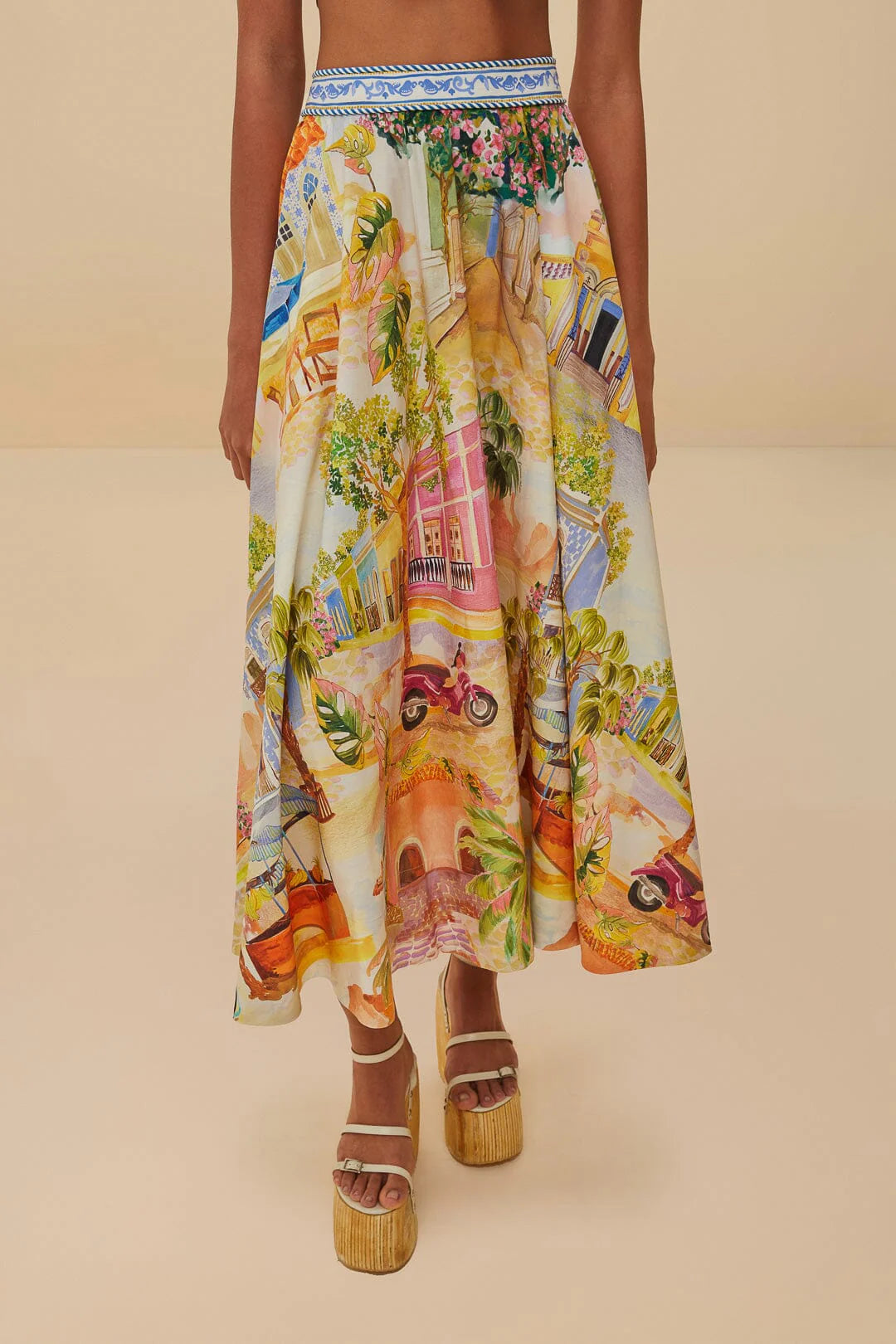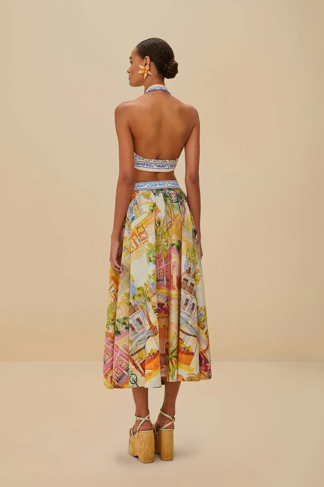Adéntrate en un mundo vibrante con la falda midi de algodón orgánico multicolor Aracati. Confeccionada con materiales responsables, su silueta fluida presenta un encantador tapiz de escenas tropicales en verdes exuberantes, amarillos brillantes y rosas suaves. La cintura artesanal añade un toque delicado, complementando el arte lúdico que encarna un encanto de espíritu libre. Abraza la esencia de la alegría viajera con cada giro de esta encantadora pieza.