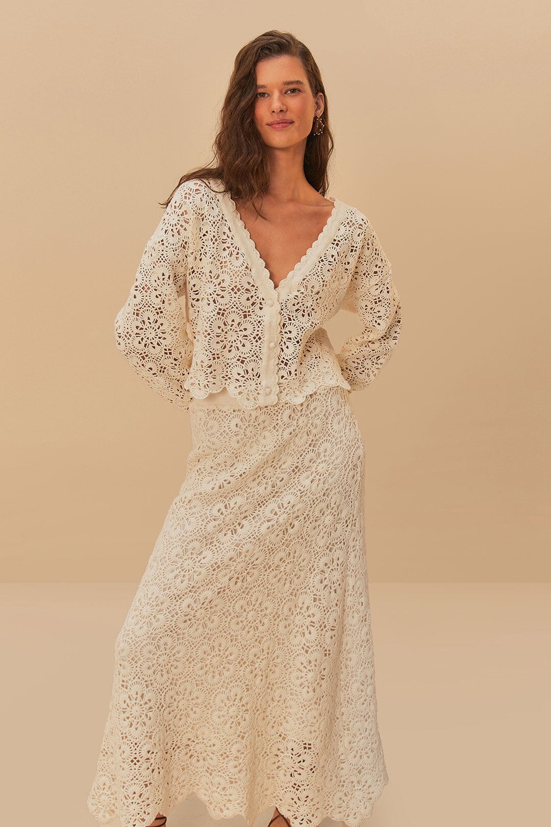 Adopta la elegancia atemporal con la falda de crochet Flower Off-White de FARM Rio. Esta falda está bellamente confeccionada con intrincados patrones florales de ganchillo que evocan una sensación de delicada sofisticación. La silueta fluida ofrece un ajuste elegante, mientras que el tono blanco roto añade un toque de pureza y encanto. Perfecta para crear looks chic sin esfuerzo, esta prenda captura la esencia de la alegría y la elegancia en un diseño deslumbrante. FARM Rio