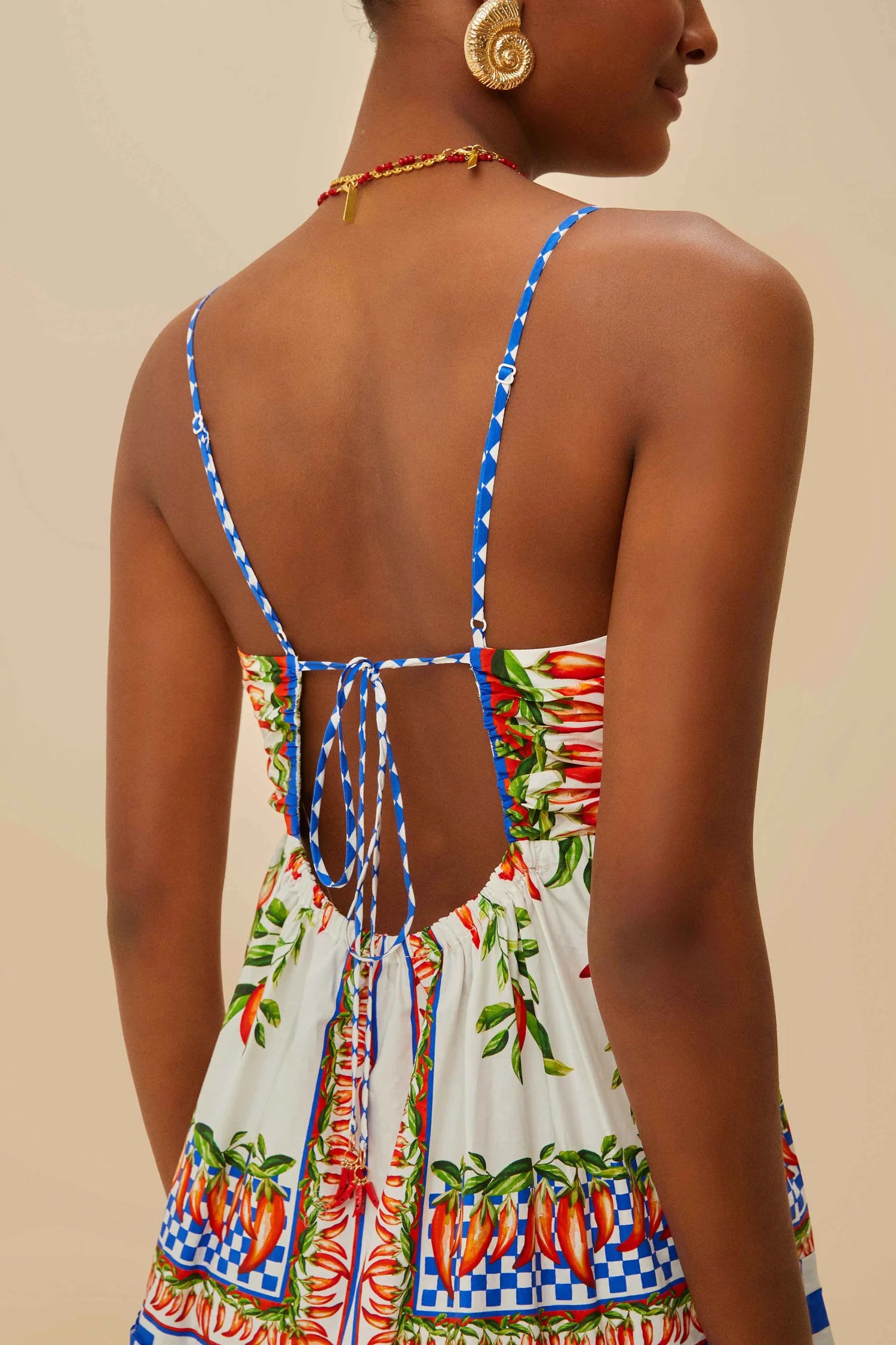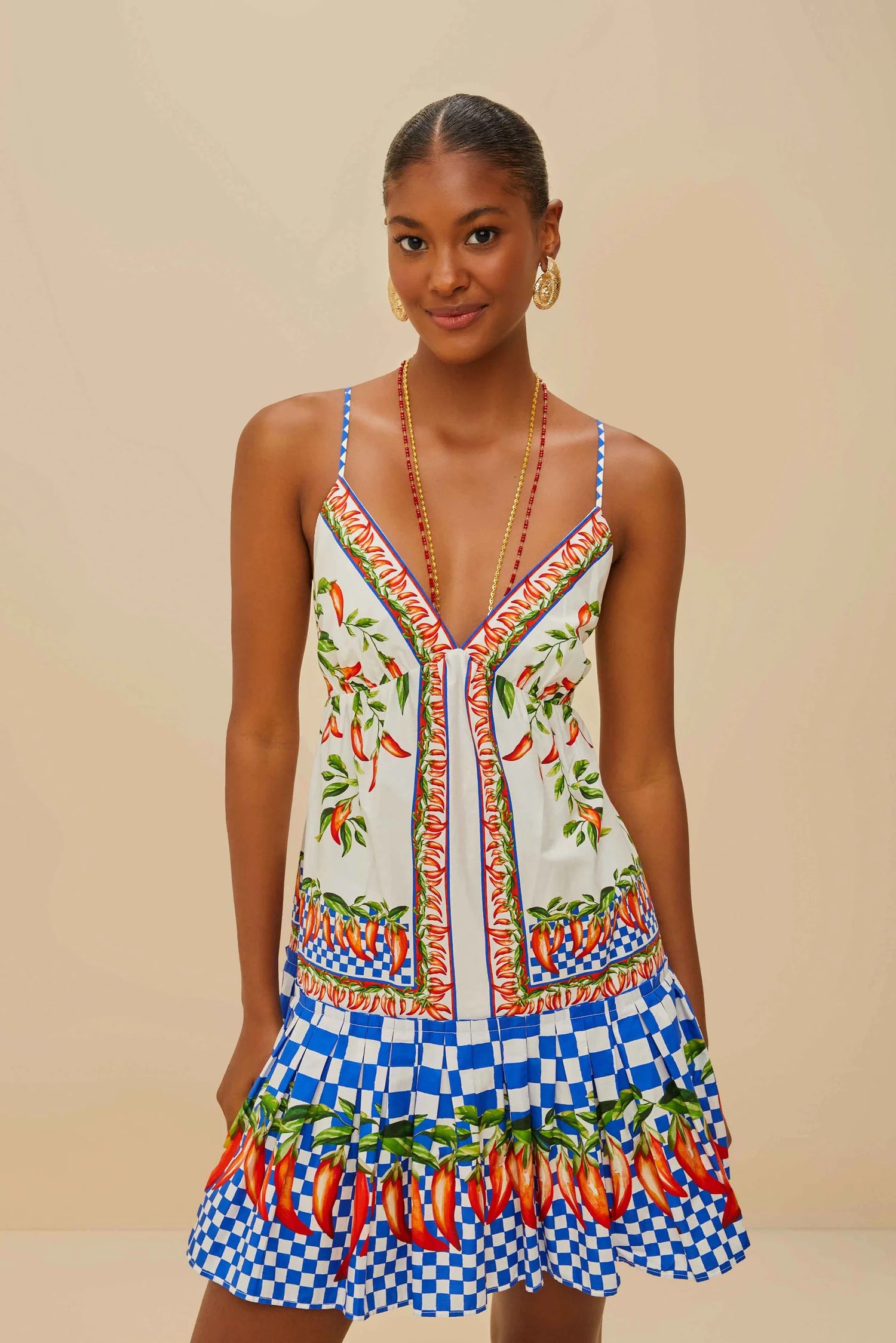 "El minivestido de algodón orgánico Picnic Peppers Ainika de Off-White captura la esencia de la elegancia juguetona con un vibrante motivo de pimientos y un alegre dobladillo a cuadros. Su favorecedor escote en V y su espalda ajustable añaden un toque de sofisticación. Confeccionado con materiales responsables, este vestido irradia un alegre encanto perfecto para las aventuras soleadas. Una prenda encantadora que aúna estampados caprichosos y estilo desenfadado, encarnando la enérgica estética de FARM Rio.