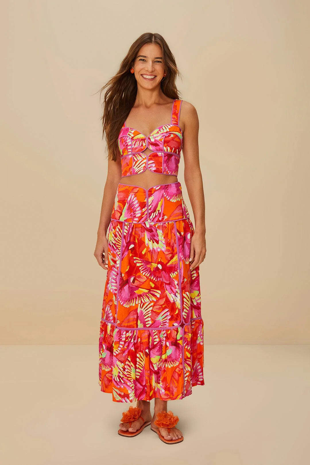"El Crop Top LENZING'Euroflax'Orange Flying Birds encanta con su vibrante paleta de naranjas, rosas y toques de verde, capturando la esencia de la exótica belleza aviar. Su escote corazón y su diseño estructurado ofrecen una elegancia juguetona, perfectamente complementada por el brillante y atrevido estampado de pájaros. Confeccionado con materiales responsables, este crop top es una radiante expresión de diseño artístico, que invita a la alegría y la calidez en cada momento.