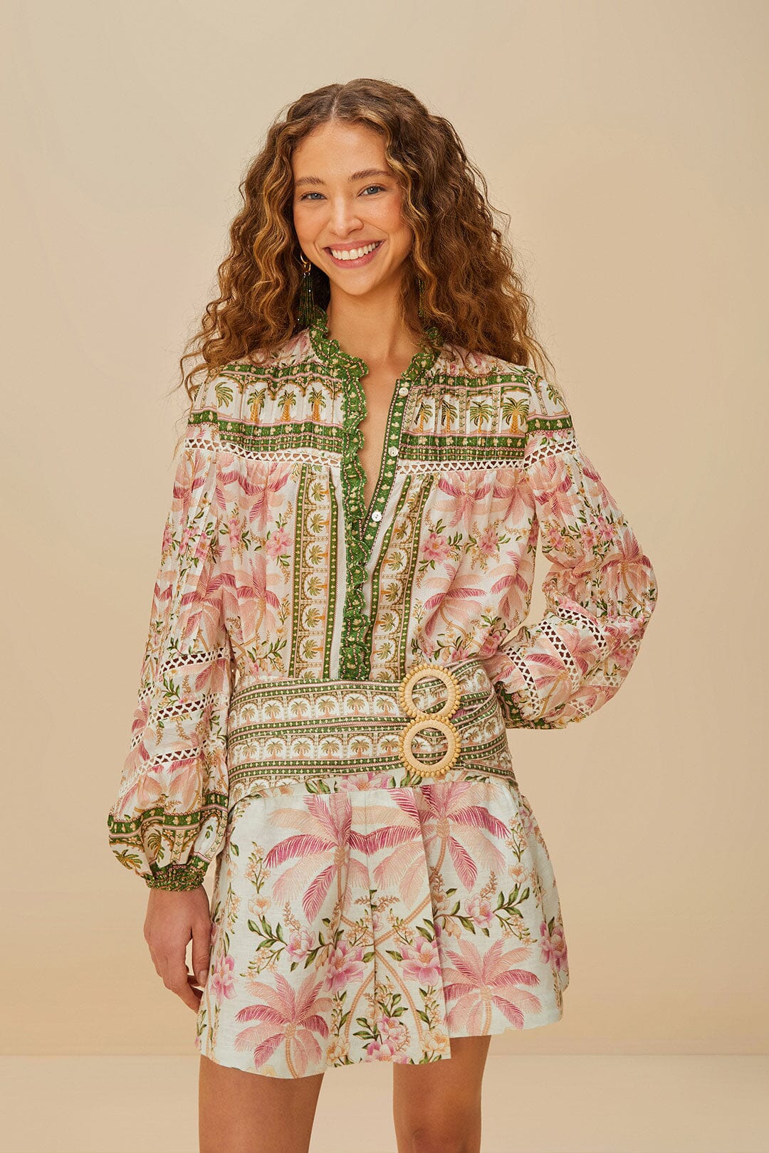 Embrace the essence of tropical elegance with the Off-White Palm Dream Blouse by FARM Rio. This enchanting piece features a lush green high neckline, complemented by intricate floral patterns in soft pinks and greens. The blouse’s exquisite eyelet fabric and playful, relaxed silhouette evoke a sense of effortless charm. With its delicate detailing and vibrant palette, this piece invites endless warmth and joy into your wardrobe.