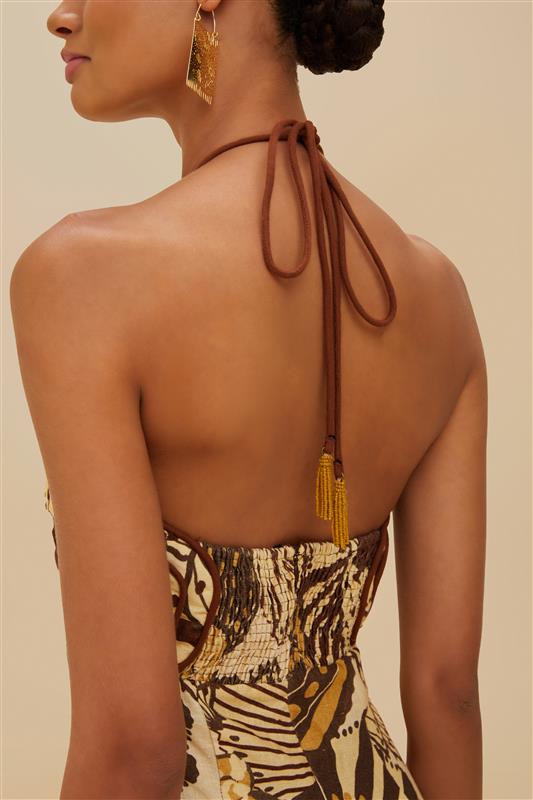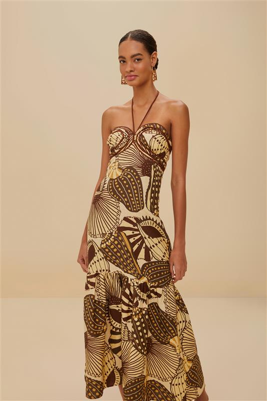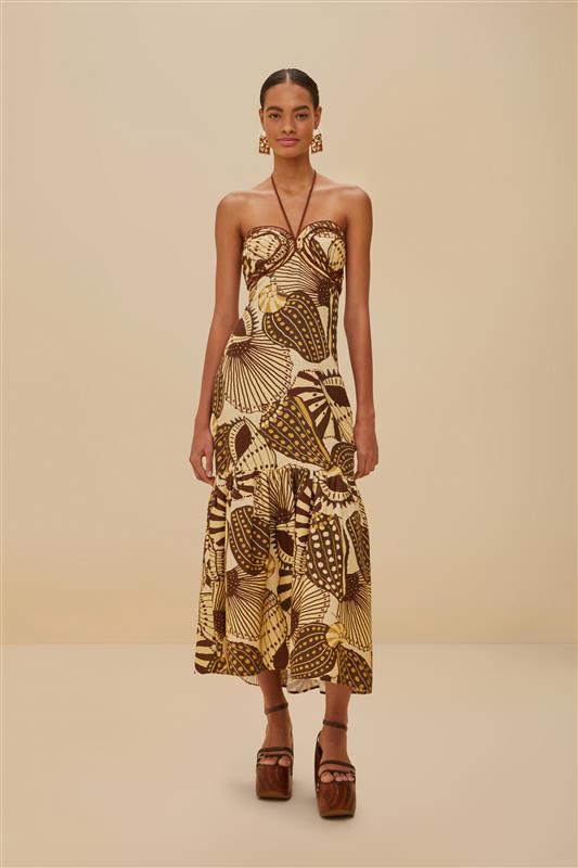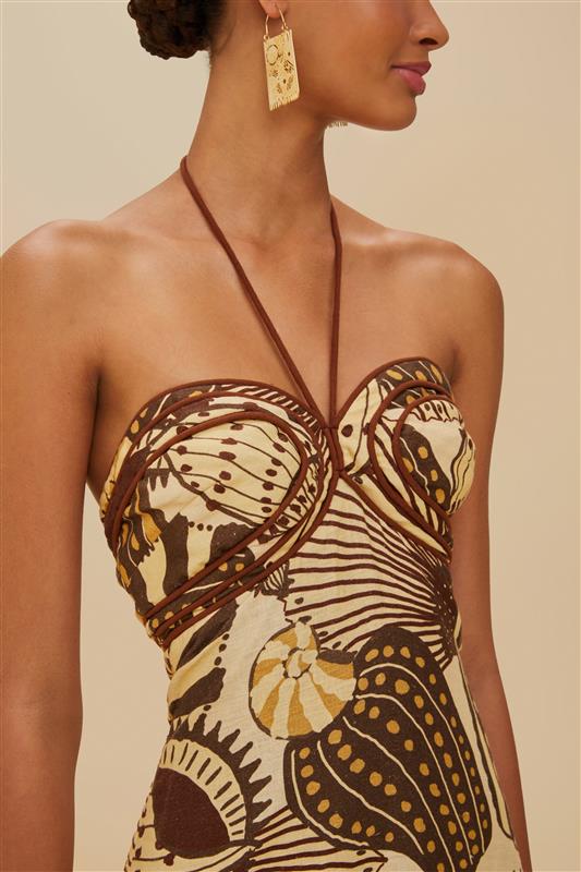 Un maxivestido de talle medio confeccionado en lino transpirable con escote halter ajustable, bajo con volantes y estampado neutro inspirado en conchas.